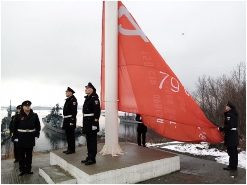 Сегодня в честь 75-летия Победы на всех кораблях, подводных лодках и судах обеспечения Северного флота были торжественно подняты государственный и военно-морской флаги, а также флаги расцвечивания. На Краснознамённой подводной лодке "К-21", которая сейчас является музеем, были также подняты флаги расцвечивания, гюйс и Краснознамённый флаг ВМФ СССР. Увеличенную копию Знамени Победы подняли на флагштоке мыса Алыш в Североморске (на фото).